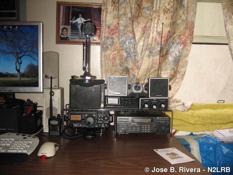 Here is a further away photo of my Yaesu FT-897D HF/VHF/UHF all mode radio and my Uniden Bearcat BC895XLT scanner, along with my MFJ Antenna Tuner and Radio SWR meter. You can also see my Astatic D-104 microphone. And did I mention my Yaesu VX-6 handheld UHF/VHF radio Photo taken on Fri, April 14, 2006