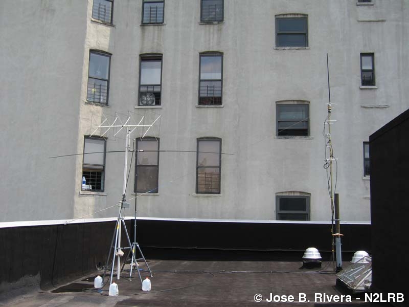 Photo of my 2 meter quad, Buddipole (left of photo) , 2 stacked 2 meter/70cm loops, 20 meter dipole and 2 meter/70cm FM vertical (right of photo), as seen looking slightly East. This photo was taken on July 3, 2006. Photo taken on Mon, July 03, 2006