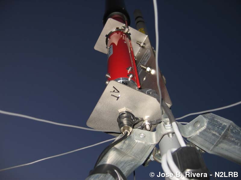 Here is the Tarheel Model 100A from the bottom. Here you see the coax connecting to the bottom of the antenna (has electrical tape on it) and the radial system (thin grey wire). Also shown is the dark and light grey Programmable Control wire on the bottom right of the photo. Photo taken on June 30, 2007 Photo taken on Sat, June 30, 2007