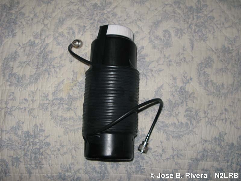 A photo of my home made Balun2. As you can see it is RG-58 Radio Shack coax wrapped around a long plastic drinking bottle. Electricl tape is used to keep it in place and to protect it from the elements. The balun will always be outside of the window or on the roof. Photo taken on Wed, February 09, 2011