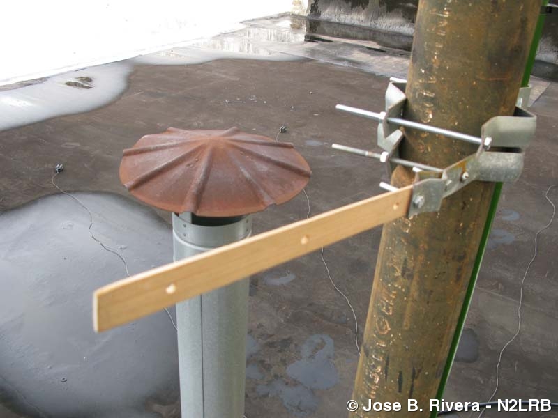 This is like what it looks like. A regular 12 inch ruler on the vent pipe mount. The ruler might be used to keep my 2 Meter/70cm J-Pole antenna away from the metal vent pipe. Just thinking ahead. It is always good to experiment. You can see the edge of my S9v 18' MK II antenna against the vent pipe. Photo taken on Sat, April 23, 2011