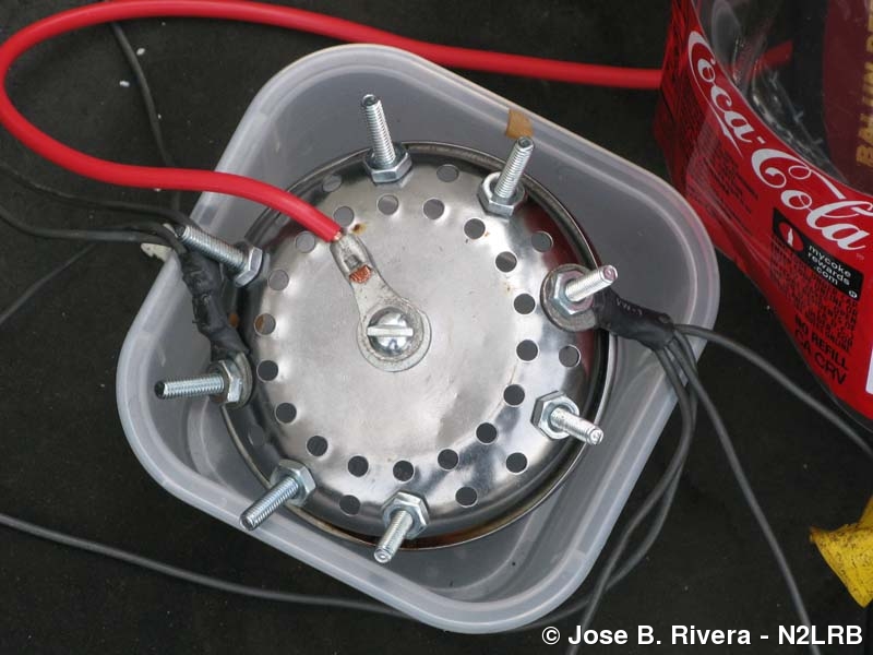 A super close up of my kitchen sink strainer radial plate and Balun Design 4-1 Unun in a plastic Coke bottle on the right. Photo taken on Wed, April 27, 2011