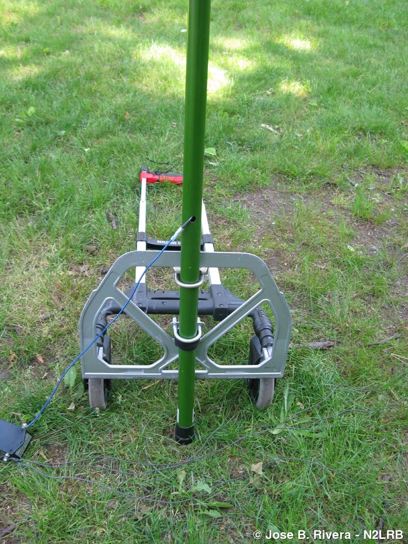 A closer look at my S9v 18' MK II HF antenna attached to the hand truck mount. You can see my Balun Design 4-1 Unun to the lower left of the photo. You can also make out my radial wire on the grass. The radials wires are attached directly to the Balun Design 4-1 Unun. Photo taken on Sat, May 28, 2011