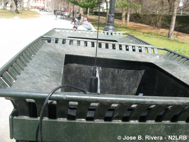 A close-up of my 2m/70cm mag mount antenna on the Central Park Metal Garbage can. Photo taken on Fri, March 29, 2013