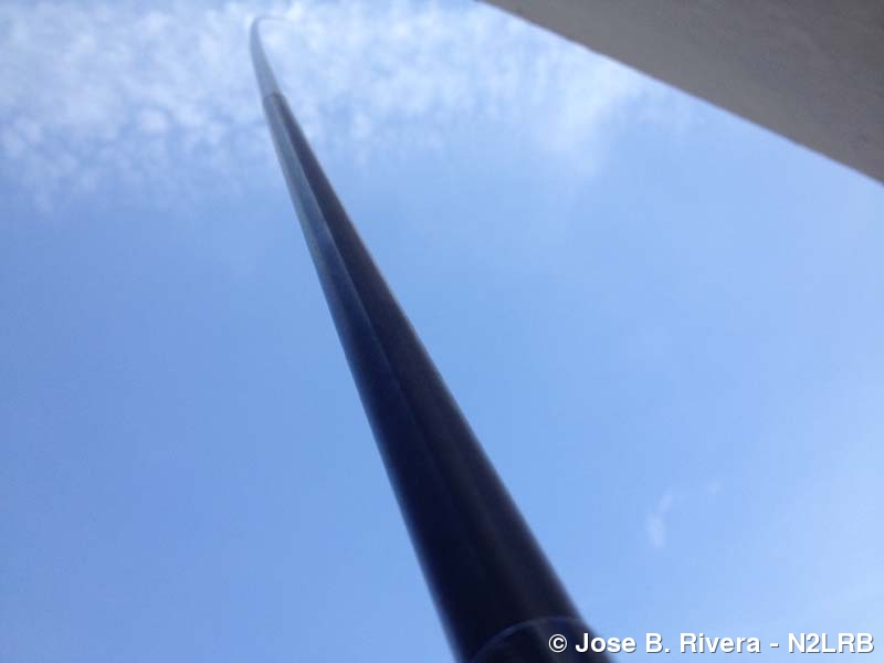 A view of my MFJ-1979 16.5 foot telescoping whip antenna as it jets out into the air. Photo taken on Mon, April 14, 2014
